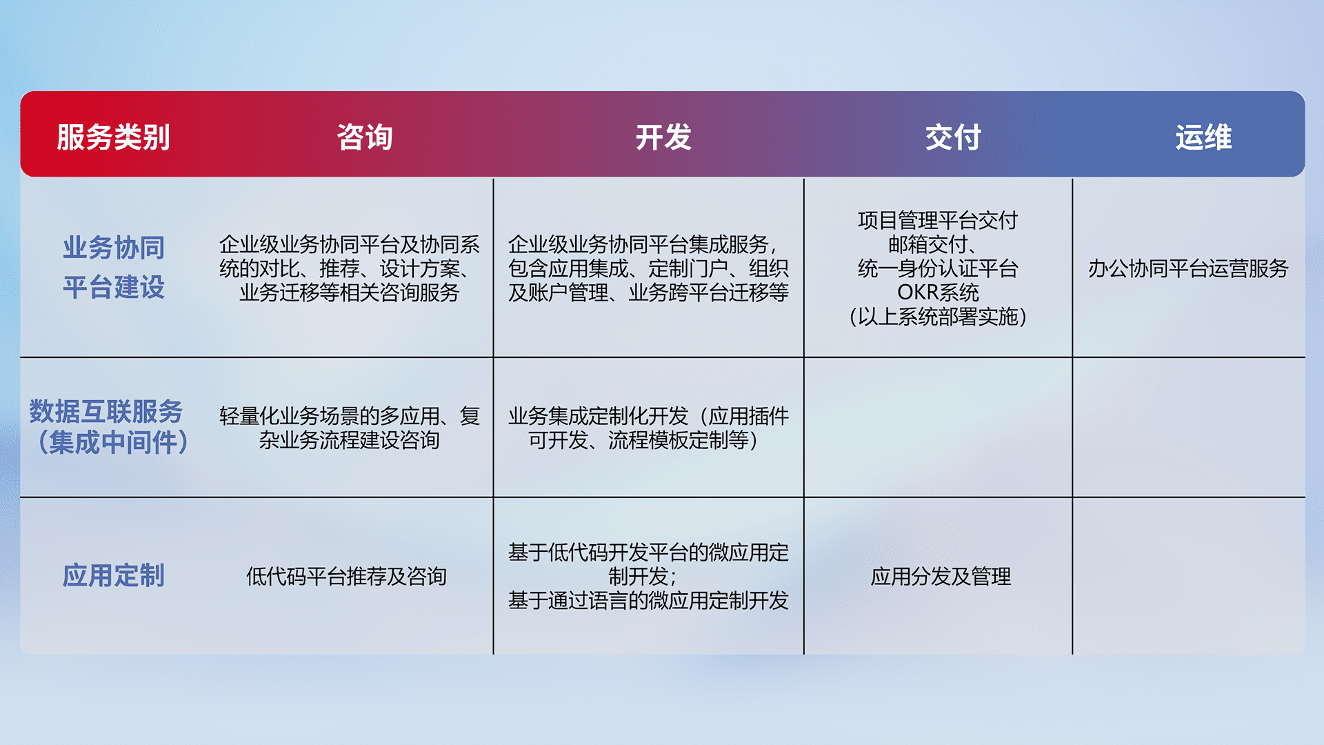 针对钉钉、、、、企微、、、、IDaas等平台级产品提供产品的规划、、、、方案、、、交付、、、定制化开发等服务,,,,实现如统一协同办公、、、、智能客户服务、、、混合会议管理、、智能数据查询、、、等业务场景,,,实现数字化转型。。。。