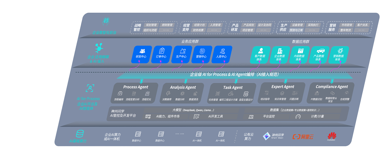 端到端的一站式AI工作空间深度融合了从企业战略规划到日常经营的全流程业务板块,,定向解决车企内部领域多、、部门多、、链条长、、、、场景碎片化等难题,,,,支持车企快速构建以AI为核心的生产力写作体系,,,实现任务执行与AI能力的无缝集成与交互